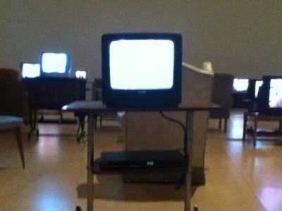 Im Museum angekommen lohnte es sich erstmal nachzufragen, ob es einen Studententarif gäbe (stand keiner an der Preistafel) und, ja, es gab ihn. So hat der Besuch nur 5 EUR gekostet (und das, obwohl ich nur den Studentenausweis aus dem WiSe 2010/2011 dabei habe...). Das Museum an sich steht ja ganz unter dem Motto der modernen Künste, so ist auch das ganze Museum sehr modern von der Architektur her gestaltet worden. Mit dem klassichen "Bilder angucken" hat dieses Museum jedenfalls nichts zu tun; Gleich im ersten Raum stehen 40 Sessel/Stühle und vor jedem Sessel/Stuhl läuft ein Fernseher mit einem anderen Programm. In jedem Programm berichten Leute aus der Türkei oder aus Kuba (keine Ahnung warum gerade diese beiden Ländern, vermutlich wegen des Linksputsches in Beiden) von ihrem Schicksal. Das ganze formiert sich dann aber zu einer großen, überwältigenden Geräuschkulisse. Leider darf man offiziell keine Fotos machen, daher nur ein verstohlener Schnappschuss:
